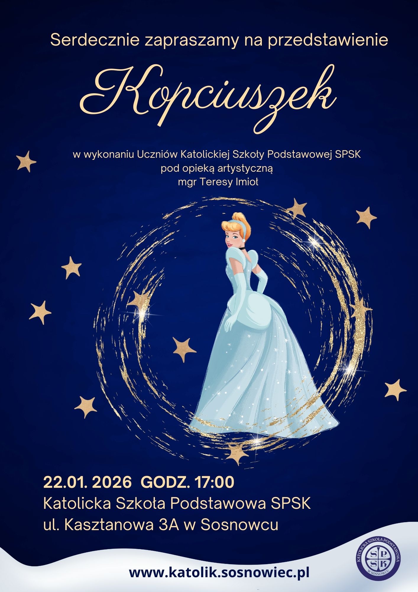 Uczniowie klas 1–6 Katolickiej Szkoły Podstawowej SPSK zapraszają na spektakl pod tytułem „Kopciuszek”, który odbędzie się 22 stycznia 2026 r. o godz. 17.00 w budynku szkoły przy ul. Kasztanowej 3A w Sosnowcu .